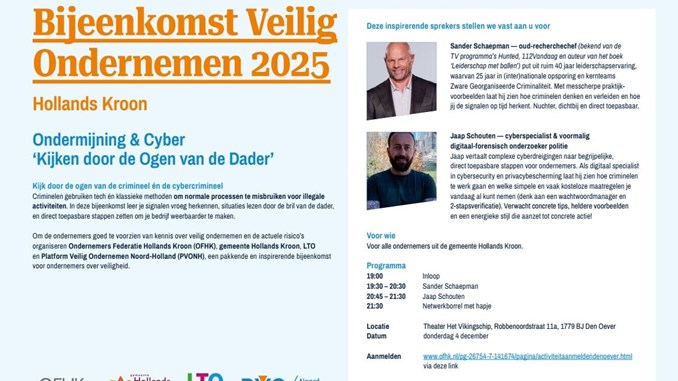 De OFHK organiseert in samenwerking met het Platform Veiligheid Noord-Holland, LTO Noord en de Gemeente Hollands Kroon op donderdag 4 december 2025 een ondernemersbijeenkomst over Veiligheid met o.a. als gastspreker Sander Schaepman en Jaap Schouten.