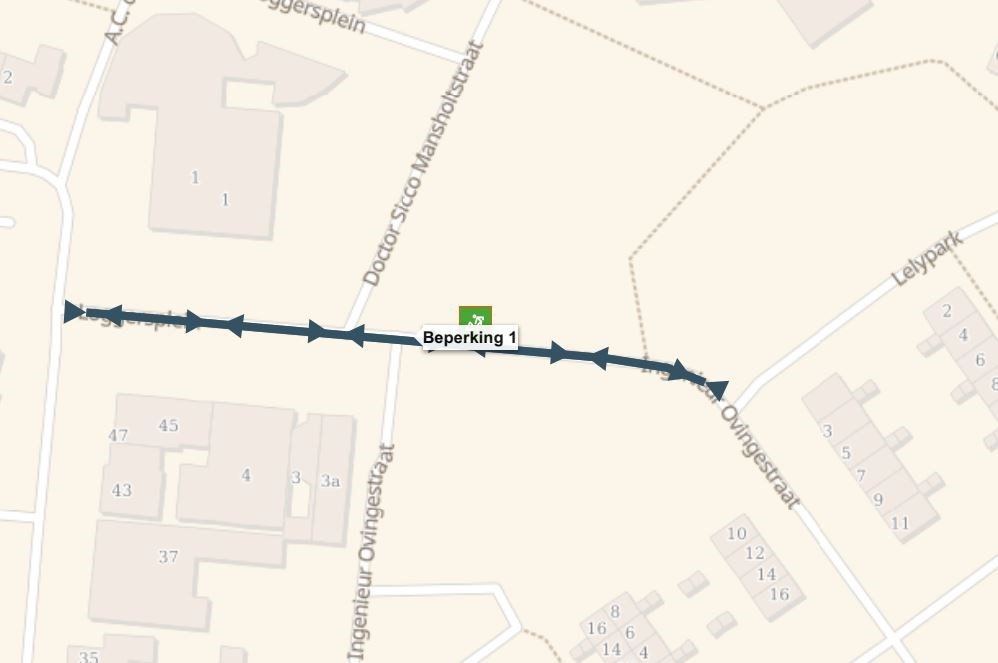 De Ing. Ovingestraat in Wieringerwerf is afgesloten wegens werkzaamheden aan de hoofdrijbaan tussen de Sternstraat en de Pr. Marijkestraat.